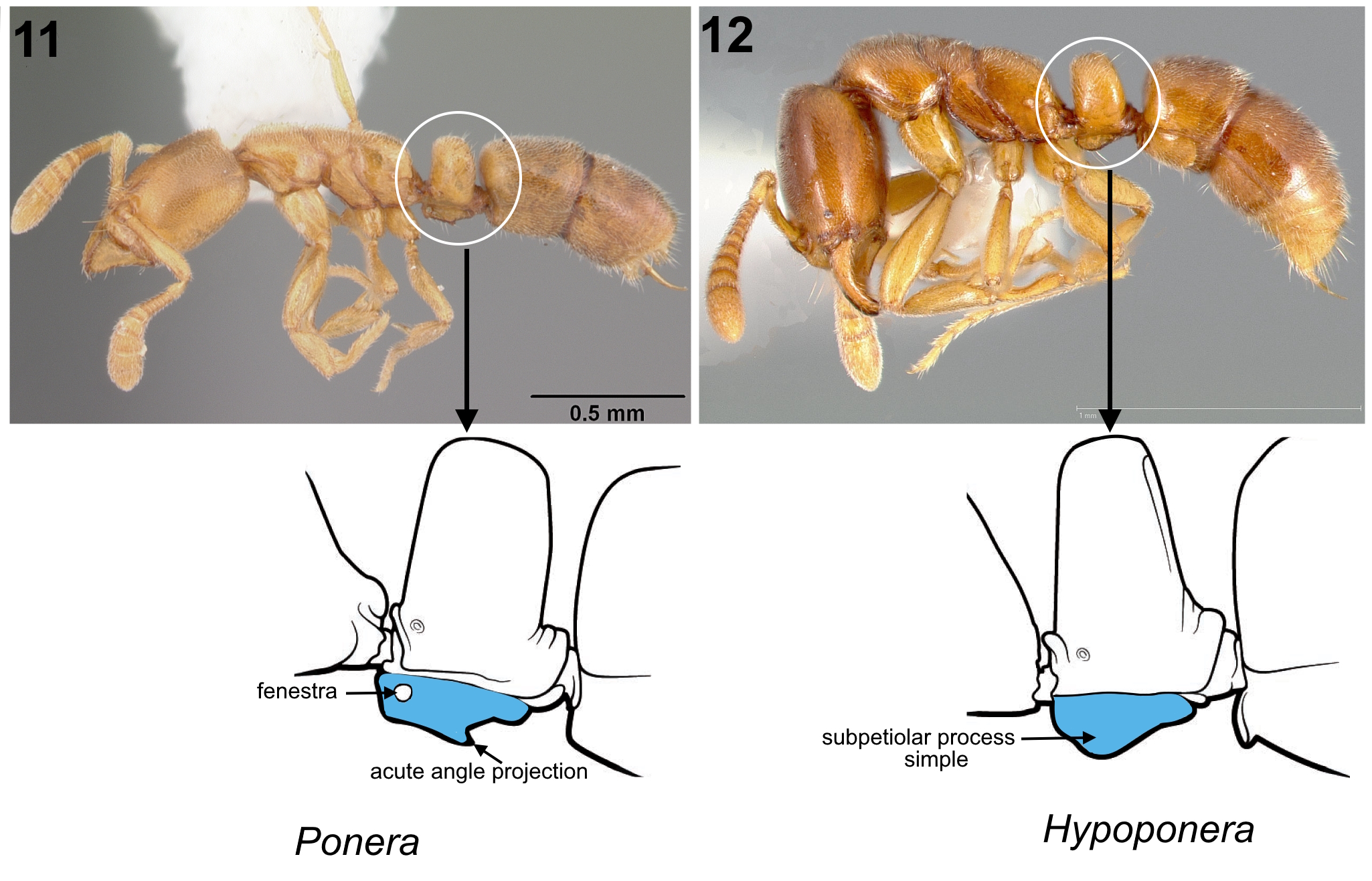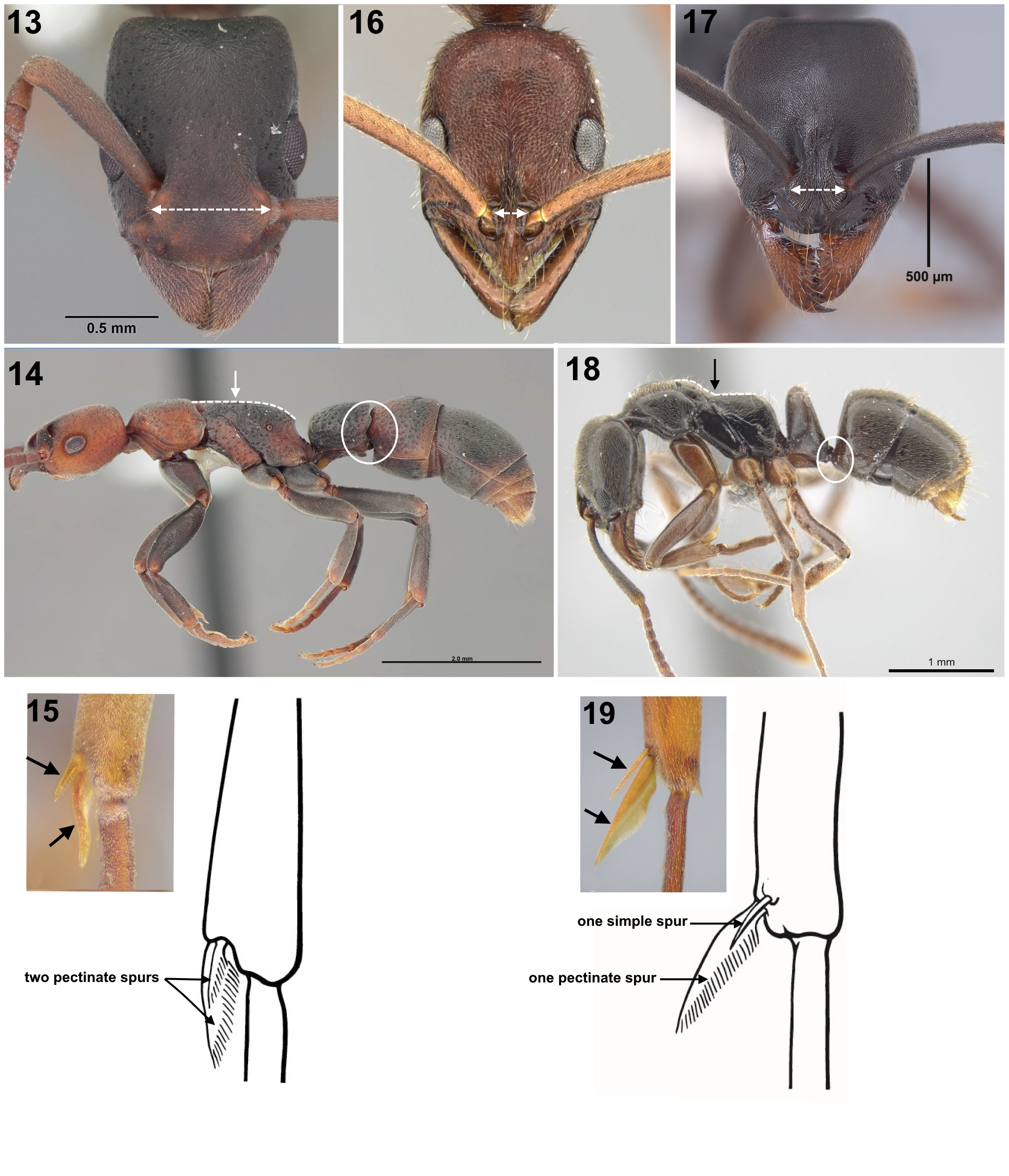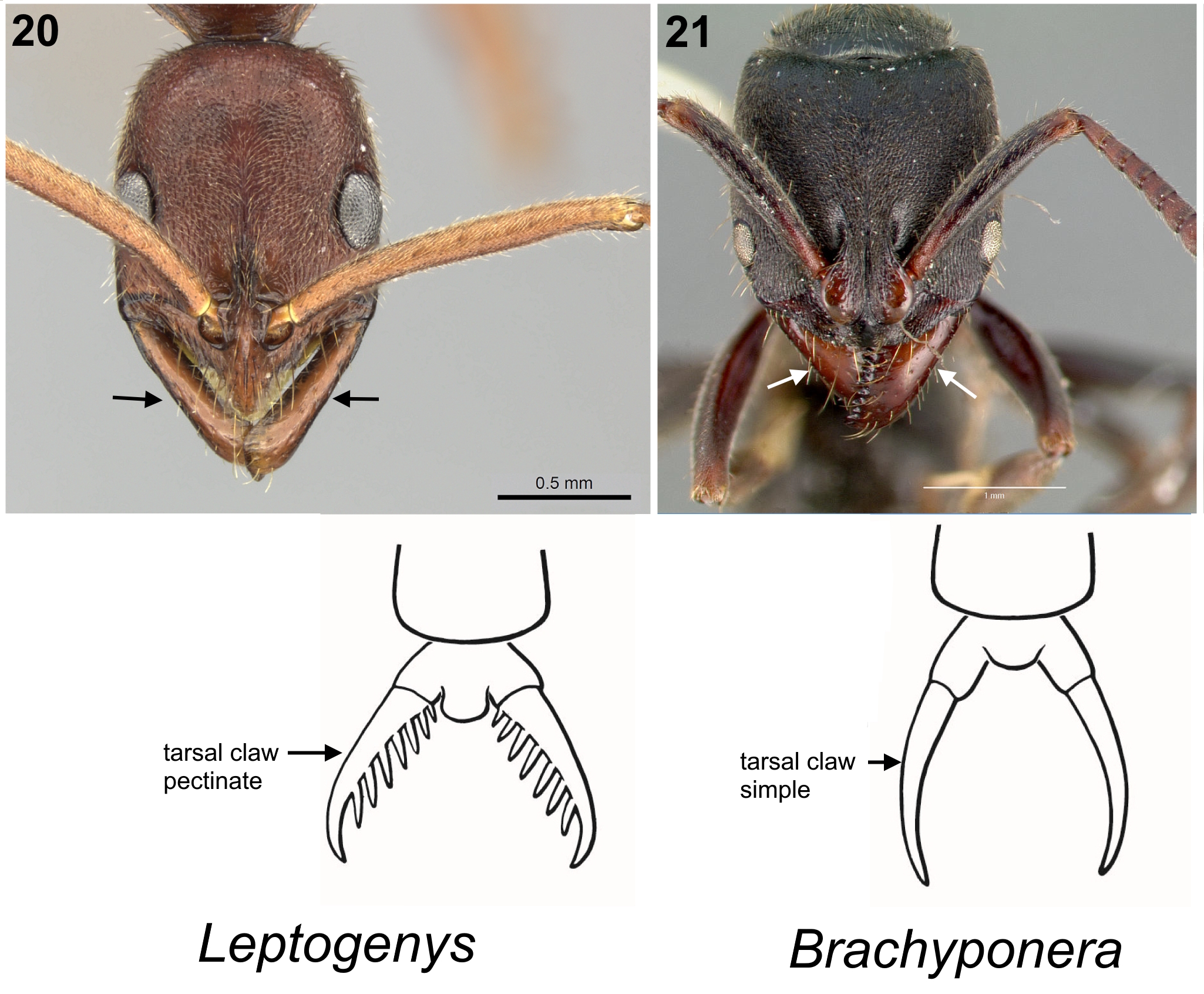 5 (4). Subpetiolar process in profile with an acute posteroventral angle and with an anterior translucent fenestra (circular thin spot) (Fig. 11); maxillary palp 2-segmented ...Ponera – Subpetiolar process in profile a simple lobe, without an anterior fenestra or translucent thin spot (Fig. 12); maxillary palp 0–1 segmented ... Hypoponera 6 (4). Antennal sockets widely separated; frontal lobes flattened in full-face view (Fig. 13). Promesonotal suture present, metanotal suture absent; petiole elongate-rectangular in profile, longer than high, broadly attached to gaster (Fig. 14). Mid and hind tibiae each with two pectinate spurs (one large, one small) (Fig.15) ... Platythyrea punctata (rarely collected; southern Florida and extreme southern Texas) – Antennal sockets closely approximated; frontal lobes not flattened (Fig. 16-17). Both promesonotal and metanotal sutures present; petiole not elongate-rectangular in profile (Fig. 18). Mid and hind tibiae each with two spurs: one large and pectinate, the other small and simple (Fig. 19) ... 7 7 (6) Mandible slender and elongated and without teeth on inner margin (Fig. 20). Tarsal claws on the hind legs finely pectinate … Leptogenys - Mandible always subtriangular and armed with teeth (Fig. 21). Tarsal claws on hind legs simple, without teeth on inner margin …8