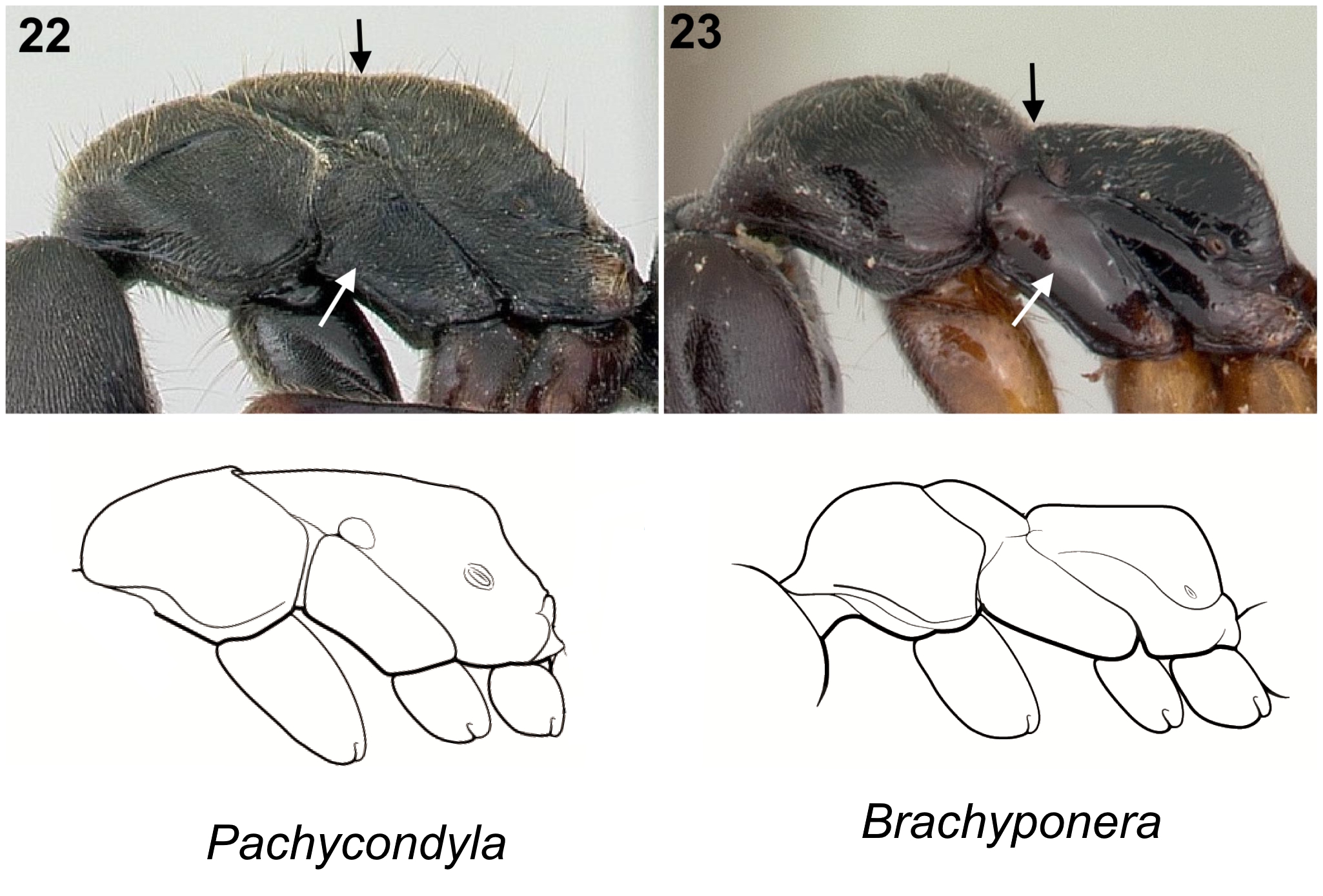 8 (7) Mesosoma robust; dorsal outline in profile evenly and continuously convex from pronotum to propodeum, without a distinct metanotal impression; propodeum broadly rounded (Fig. 22) ... Pachycondyla harpax – Mesosoma more elongate and less evenly convex; dorsal outline with a distinct metanotal impression separating mesonotum and propodeum; propodeum more flattened to weakly angulate posteriorly (Fig. 23) ... Brachyponera chinensis