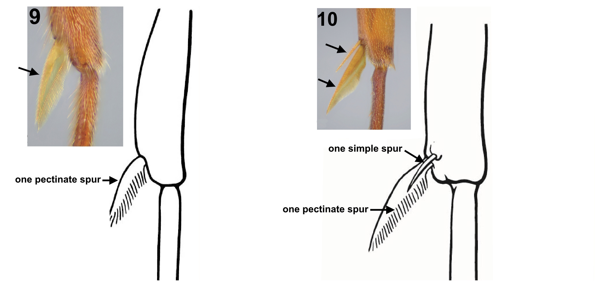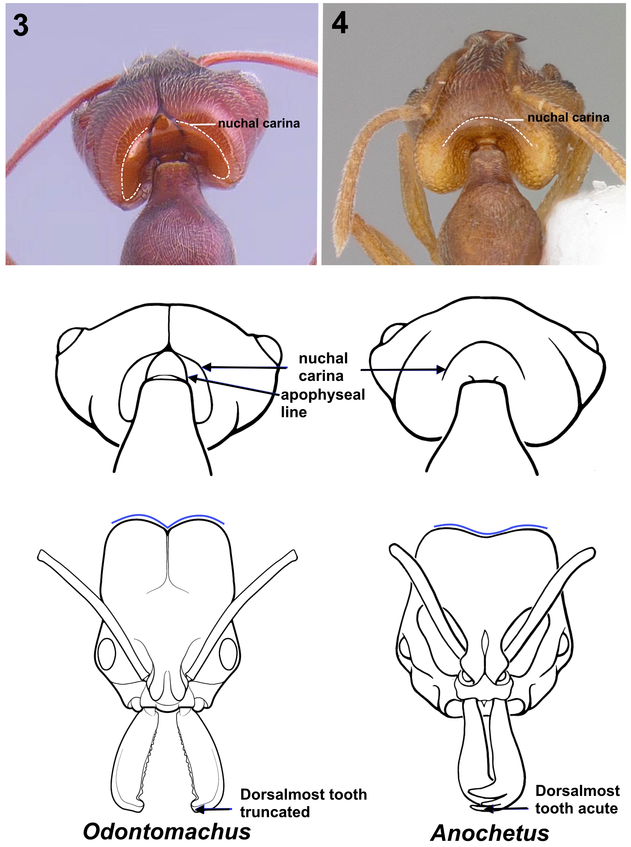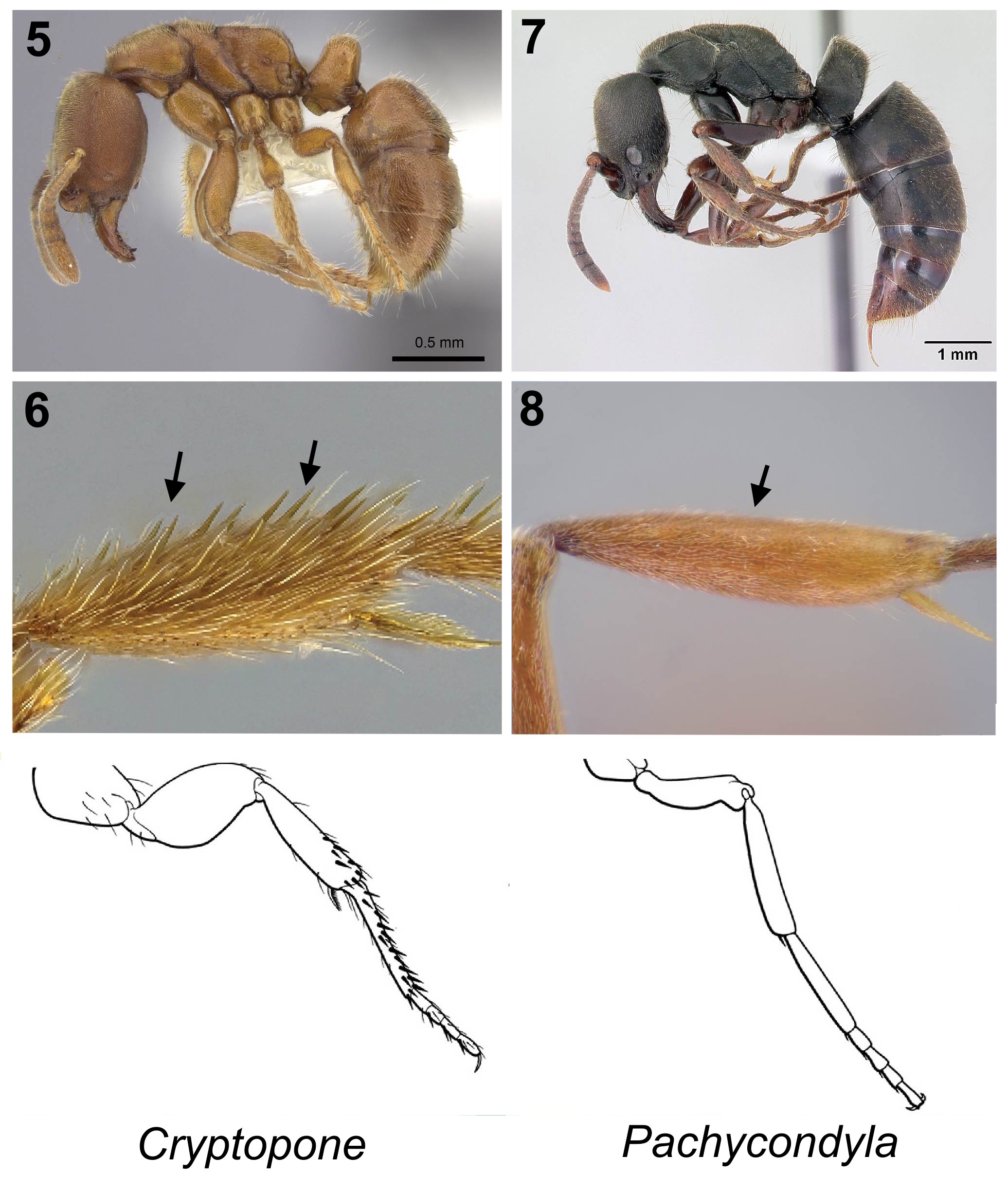 1. Mandible elongate and linear in full-face view, inserted near the midpoint of the anterior clypeal margin; apices abruptly incurved, with 2–3 teeth arranged in a vertical series; mandibular bases closely approximated (Fig. 1) …2 – Mandible linear to triangular, inserted at the anterolateral corners of the head; apices without a vertical series of teeth; mandibular bases distinctly separated (Fig. 2) ...3 2 (1). Nuchal carina converging medially, forming a distinct V-shaped posterior head margin; posterior head surface with paired dark apophyseal lines converging into a sharp median dorsal groove on vertex; dorsalmost tooth of apical mandibular series usually truncated (rarely acute) (Fig. 3) ... Odontomachus – Nuchal carina broadly rounded, forming a continuous curve across posterior head margin; posterior head surface without paired apophyseal lines; median dorsal groove absent or shallow; dorsalmost apical mandibular tooth acute (Fig.4) ... Anochetus mayri 3 (1). Eye minute (maximum diameter ≤ 0.04 mm) (Fig. 5); mesotibia dorsally with numerous stout traction setae extending along most of tibial length (Fig. 6 ) ...Cryptopone gilva – Eye variable (Fig. 7); mesotibia dorsally without numerous stout traction setae (at most a few stout setae near tibial apex, not extending along tibial length) (Fig. 8) ...4 4 (3). Small ants, total length ≤ 3 mm; inner apex of hind tibia (anterior view) with a single large pectinate spur, without a second smaller spur anterior to it (Fig. 9) ... 5 – Larger ants, total length > 4 mm; inner apex of hind tibia (anterior view) with two spurs: either both pectinate (one large, one small) (AA), or one large pectinate spur and a much smaller simple spur (Fig. 10) ... 6