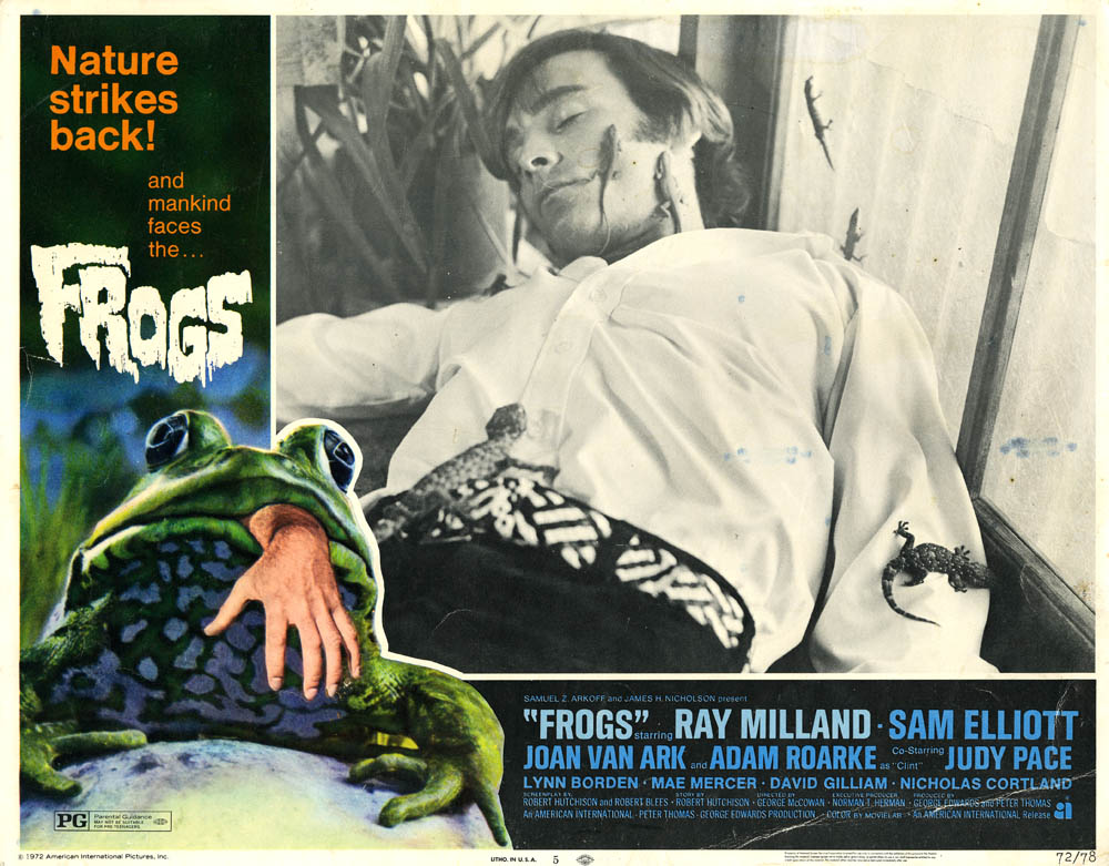 Type: Lobby Card, 11" X 14" Condition: Good - small bend on corner Age: 1972 Insects Images: none Description: Frog with man's hand sticking out from its mouth; still of man ilaying on ground covered in geckoes |