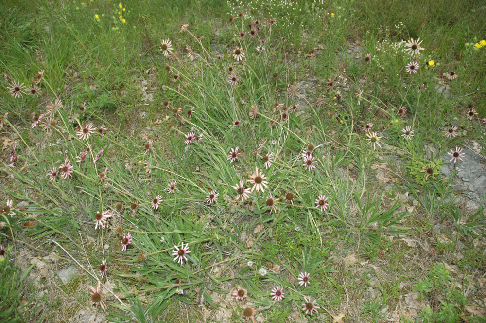 Although it was a good drive to the Couchville glade (about 30 minutes), we were pleasantly rewarded by a beautiful area with an abundance of plants in bloom. Lots of Tennessee coneflower, Rudbeckia sp., Erigeron sp., Helianthus sp., Verbesina virginica, Glade clover, gum weed, and many other flowers were in bloom. Apparently, Dalea foliosa also occurs there along wet areas. The entire area, which covers about 100 acres, is a mix of forb rich glades, grassy barrens, and cedar/hardwood forests. A one mile loop trail made it easy to walk through the area, and we spent a couple of hours there collecting and looking around.