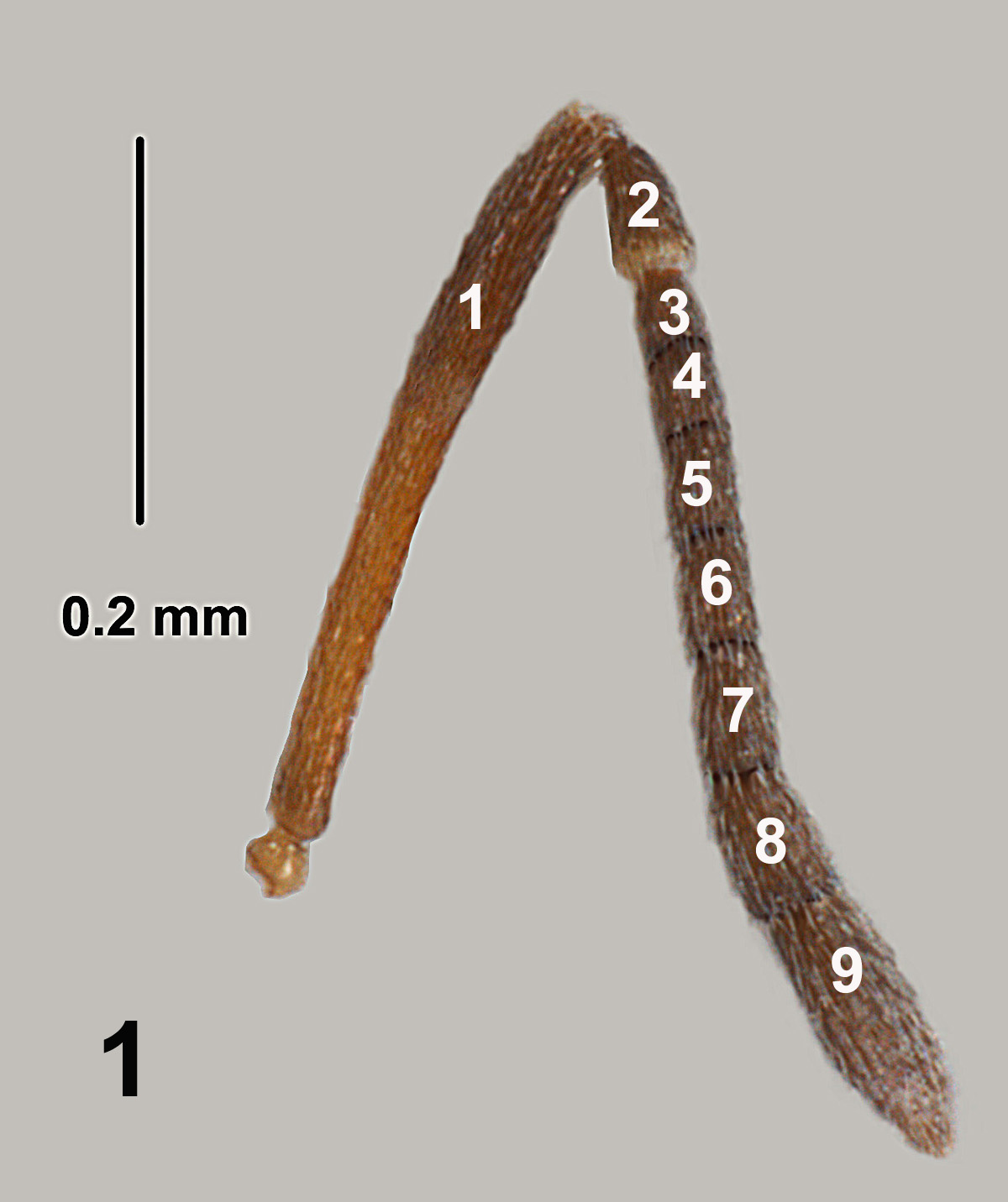 | 1 | Antennae with 9 segments (fig. 1), workers minute, monomorphic, frontal carinae close together, thorax short and stout | ...Brachymyrmex |