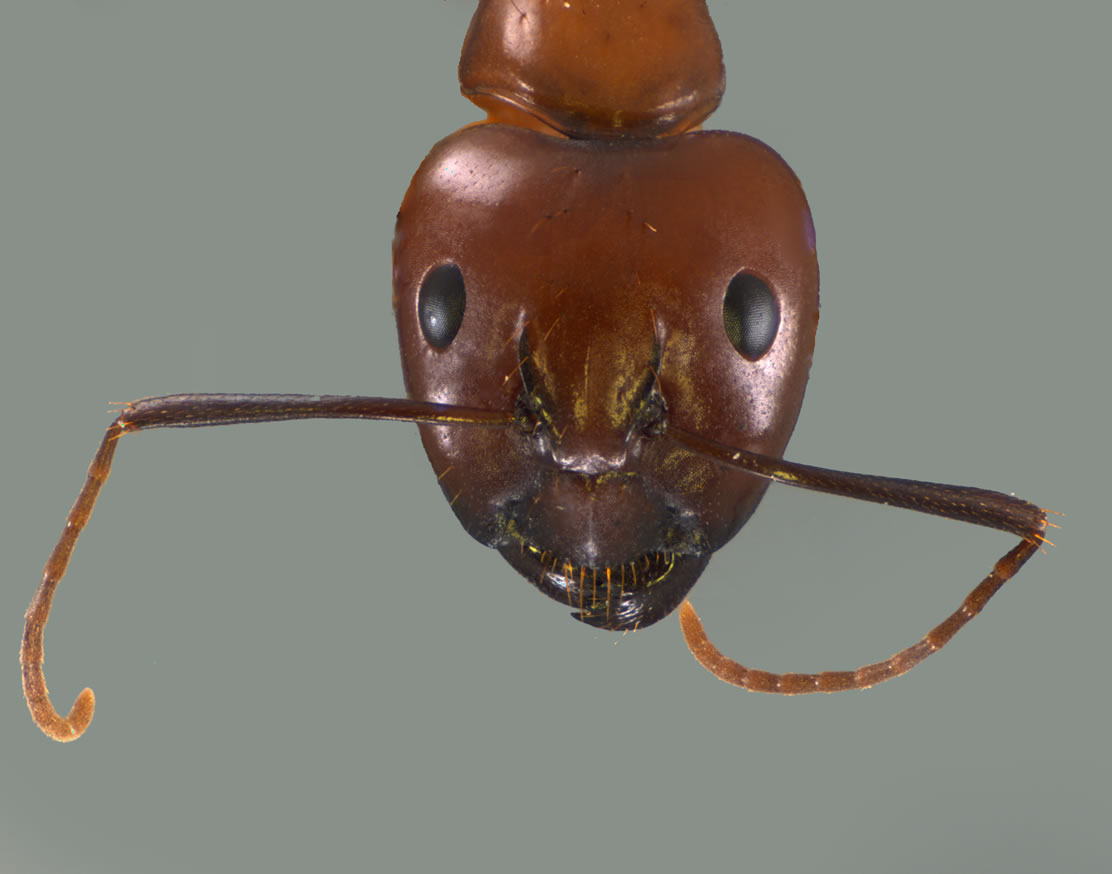 Camponotus castaneus, full face view of major. Notice the lack of erect hairs on the gena (compare to C. americanus). (click image to enlarge) |