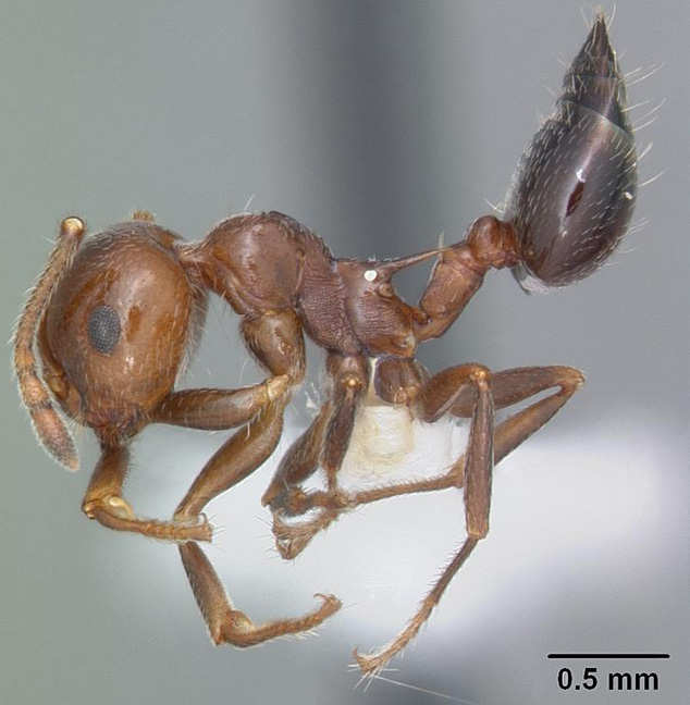 Crematogaster parapilosa, side view of a worker (click image to enlarge). Note the very long propodeal spines. Photo courtesy of http://www.antweb.org/ |