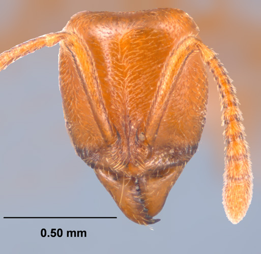 Hypoponera inexorata, full face view of worker. Note the impression on the lateral edge of the mandible (click image enlarge). |