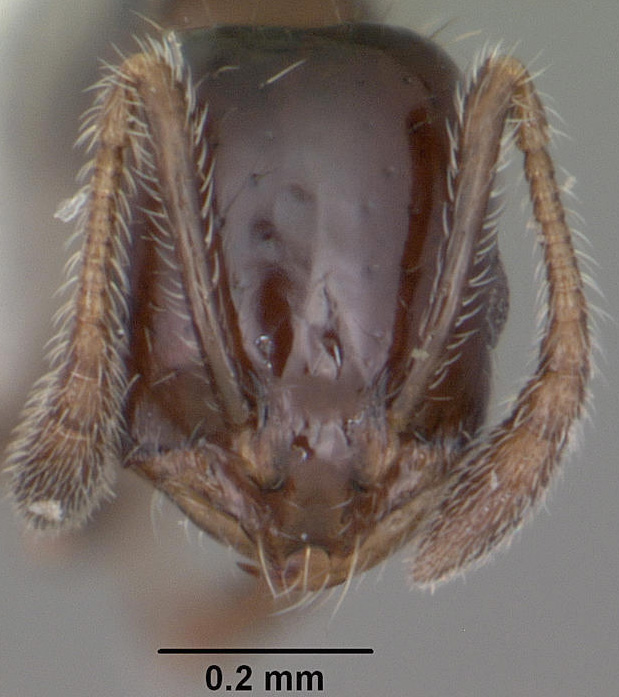 Monomorium trageri, full face view of a worker (click image to enlarge).