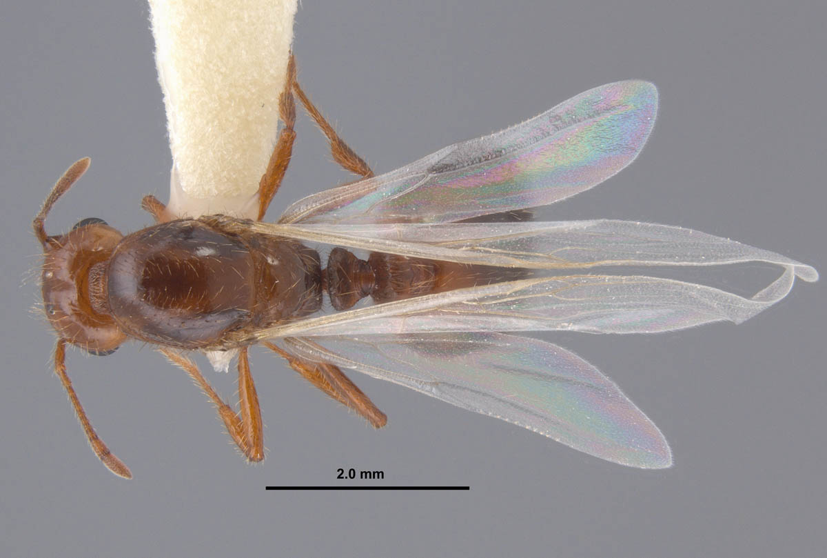 Solenopsis invicta X richteri, full fa dorsal view of an alate queen (MS, Holmes Co.) (photo by Ryan Whitehouse and Joe A. MacGown) |