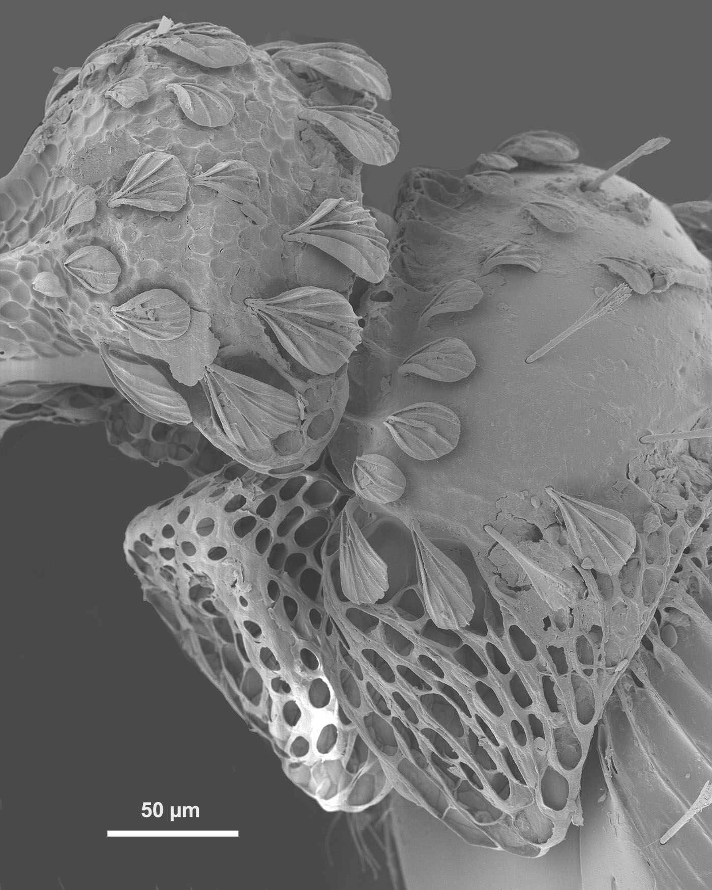 Strumigenys hexamera, closeup of scale-like setae (SEM by Joe A. MacGown and Richard L. Brown) |