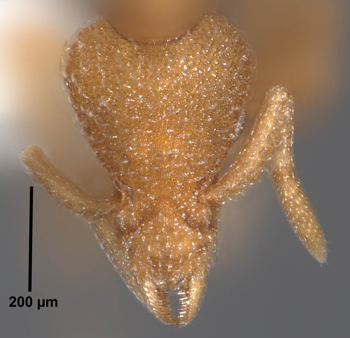 Worker: Minute, TL 1.9–2.1 mm, HL 0.52–0.58 mm, HW 0.36–0.42 mm, CI 69–73 mm, ML 0.10–0.12 mm, SL 026–0.30 mm, PW 0.24–0.26 mm, MeSL 0.48–0.56 mm (measurements from Bolton 2000). Entire body reddish brown. Head pyriform, concave posteriomedially; entire head including clypeus with dense microreticulation; numerous, regularly spaced, hyaline, clavate setae directed anteriorly and inward, with setae on clypeal border forming a tight fringe; eyes large, located about midway on sides of head near ventral edge (in lateral view) and along bottom edge of antennal scrobe; three ocelli present; mandibles elongate triangular; diastema lacking, serially dentate with 7 sharply triangular teeth followed by 4 small denticles and terminating in slightly enlarged apical tooth; antenna 6-segmented, scape shortleading edge of scape with a row of hyaline, clavate setae, one or more of which are curved toward the base of the scape, apical flagellomere greatly enlarged forming a 2 segmented club with flagellomere 3. Mesosoma entire, with dense microreticulation with scattered semi erect, clavate setae present dorsally; propodeum with two prominent spines directed posteriorly, lacking spongiform curtain posteriorly; promesonotal suture present. Waist two-segmented, with dense microreticulation and scattered clavate setae; petiole distinctly pedunculate, in dorsal view, node rounded rectangular, spongiform tissue present posteriorly but lacking ventrally; postpetiole rounded rectangular, about twice as wide as petiole (dorsal view). spongiform tissue present posteriorly and ventrally. Gaster with shagreened texture, with scattered, semi erect to erect clavate setae; sting present.